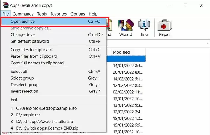 - Download the WinRAR setup from the official website. Install it, open WinRAR, and then go to File > Open archive.