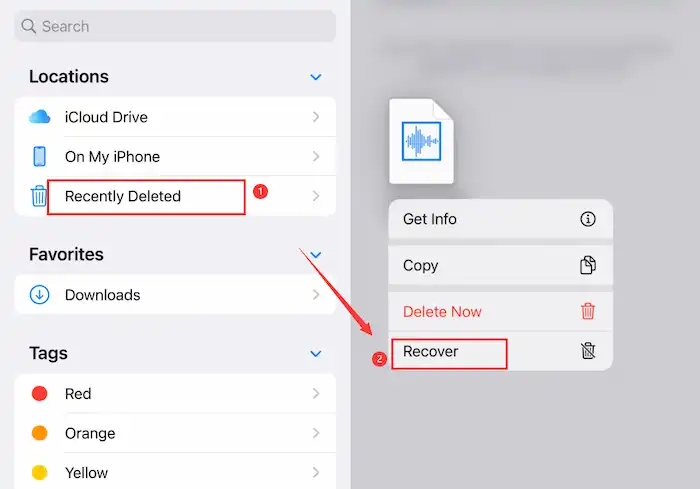 - Step 2. Long press the file you want to recover, and then a window box will pop up. Next, tap on Recover, and your lost files will return to your iPhone.