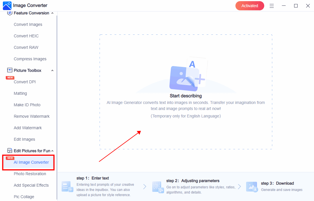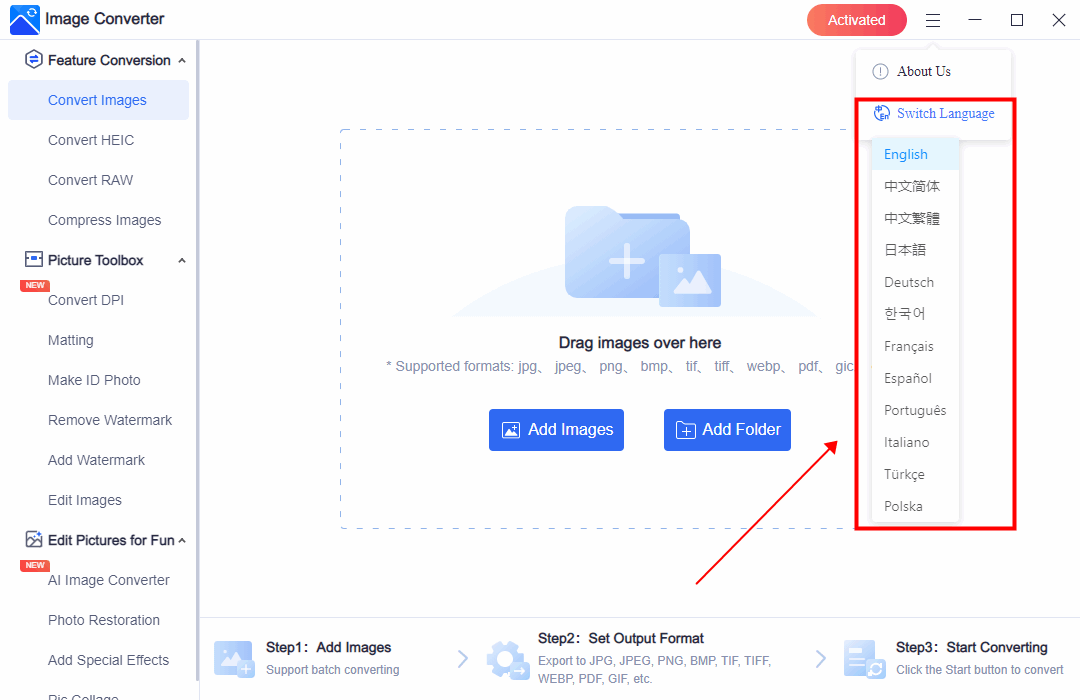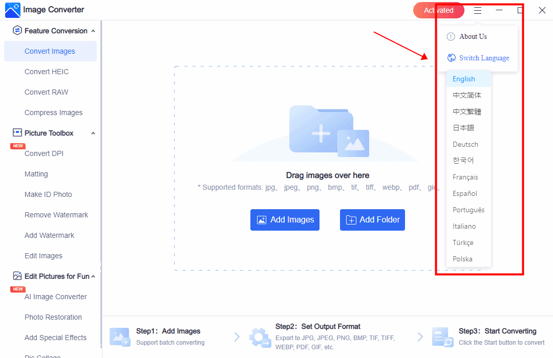 WorkinTool Image Converter übernimmt automatisch die Standardsprache des Systems. SieSie können die Sprache auch manuell auf der Software-Homepage wechseln.