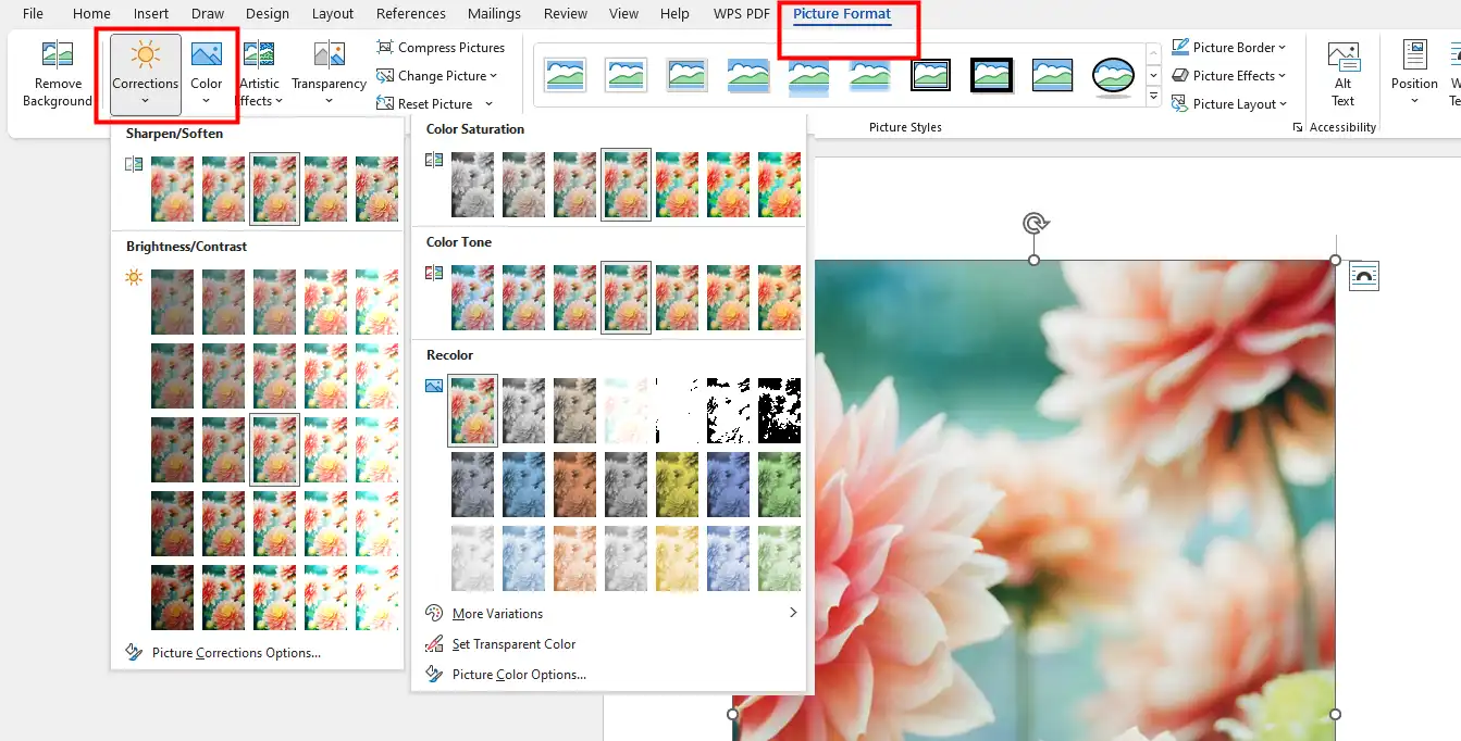 - Click the image and find theĀ FormatĀ tab under theĀ Picture Tools.Ā Here you can use theĀ CorrectionsĀ andĀ ColorĀ options to change the image color.
