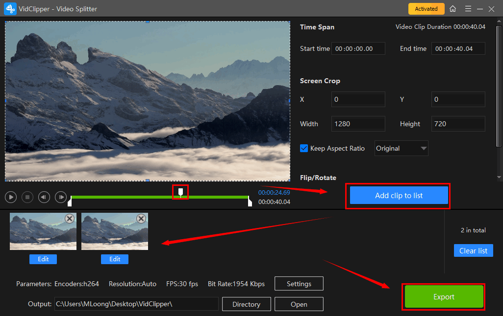 - Bölünmüş kliplerinizi kaydetmek için Listeye klip ekle düğmesine basın.