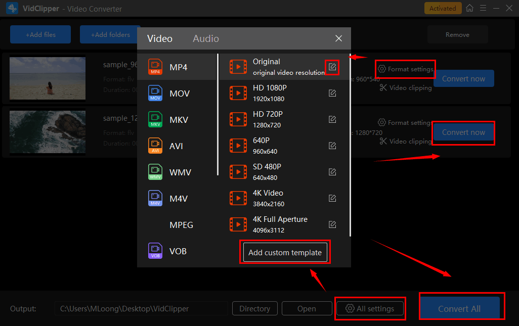 - Videonun yanındaki Biçim ayarları (tekli dönüştürme) veya Tüm ayarlar (toplu dönüştürme) kullanarak istediğiniz video formatını ve kalitesini seçin.