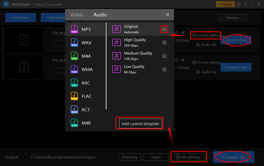 - Videonun yanındaki Biçim ayarları (tekli dönüştürme) veya Tüm ayarlar (toplu dönüştürme) kullanarak istediğiniz ses formatını ve kalitesini seçin.