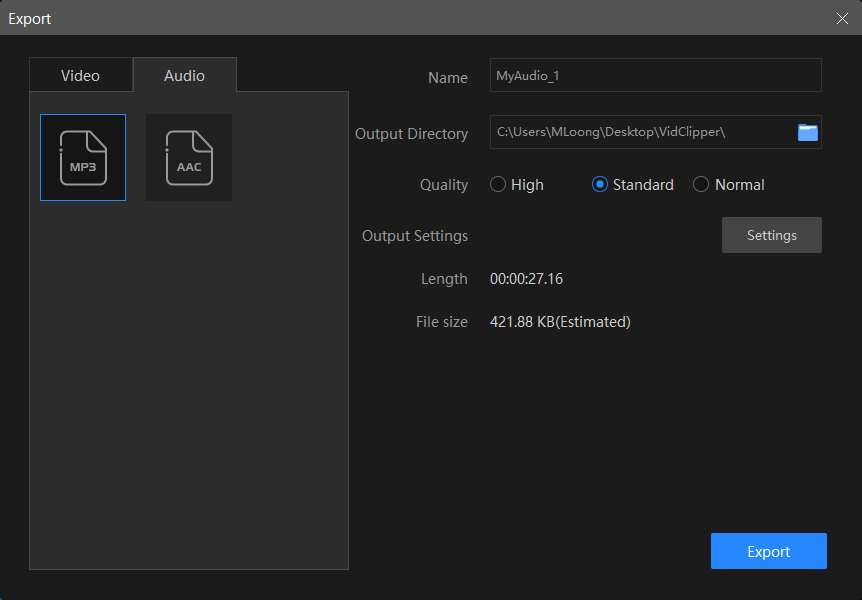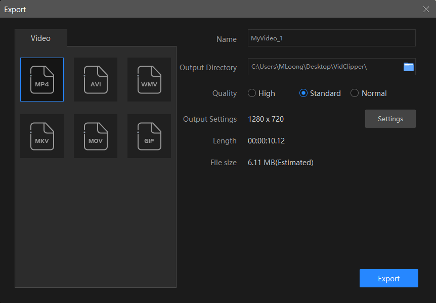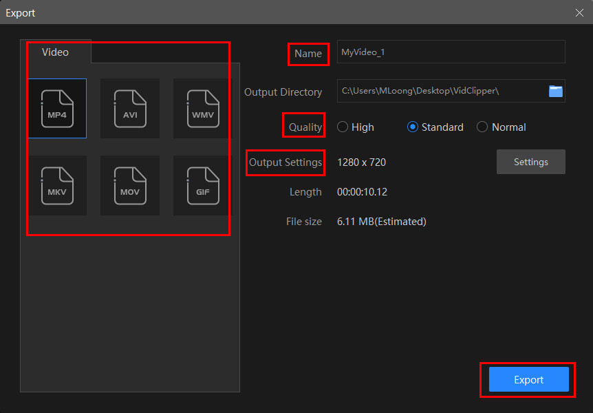 - Adım 4. Çıktı formatını/kalitesini seçin, projeyi adlandırın, kaydetme yolunuzu ayarlayın, ayarları değiştirin ve ardından Dışa Aktar'a tıklayın.