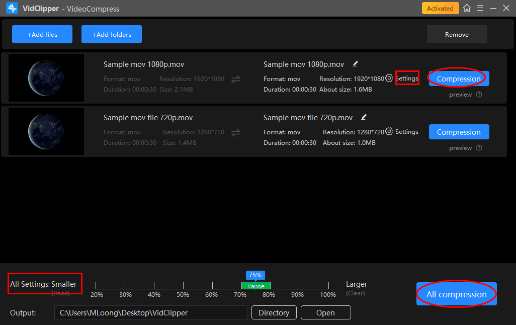 - Adım 3. Videonuzu (videolarınızı) seçilen boyuta sıkıştırmak için istenen yüzdeyi seçin ve ardından Sıkıştırma (tek sıkıştırma) veya Tüm Sıkıştırma (toplu sıkıştırma) kullanarak video(lar)ınızın boyutunu küçültün. (Her videonun yanındaki Ayarlar düğmesine basarak tek dosya için sıkıştırma yüzdesini ayarlayın).