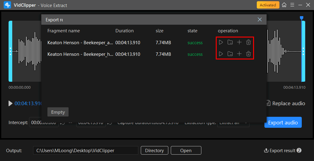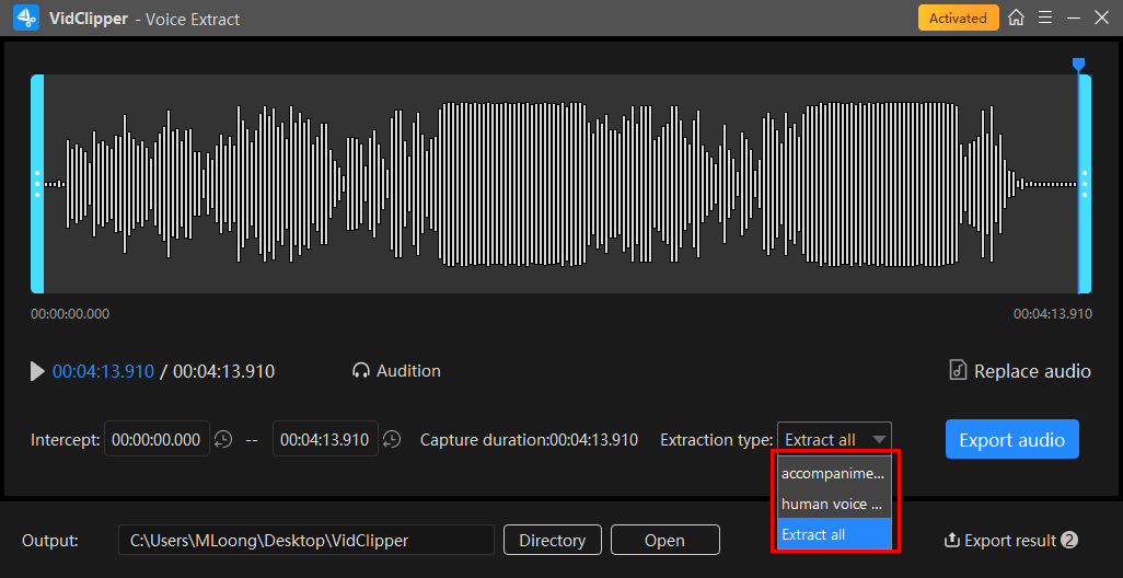 - Adım 3. İstediğiniz sesi seçin--Eşlik, İnsan Sesi ve Tümünü Çıkar (Eşlik+İnsan Sesi) seçeneğinin yanındaki açılır kutudan Sesi dışa aktar ve ardından Çıktınızı almak için Sesi dışa aktar'a basın. (Sesinizi kesmek için mavi kenarları kullanın istiyorum.)