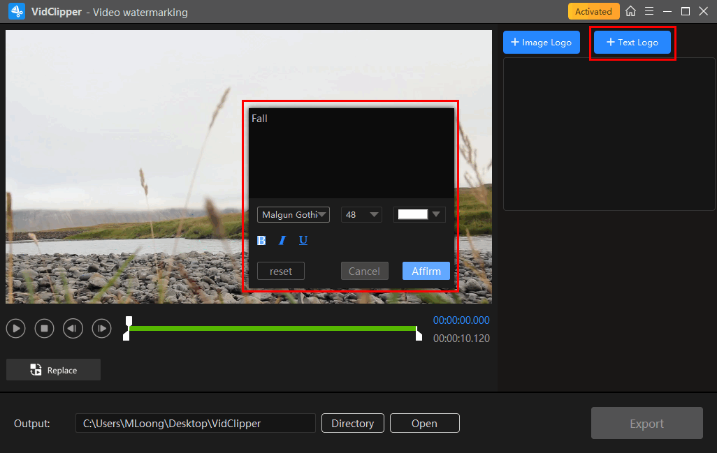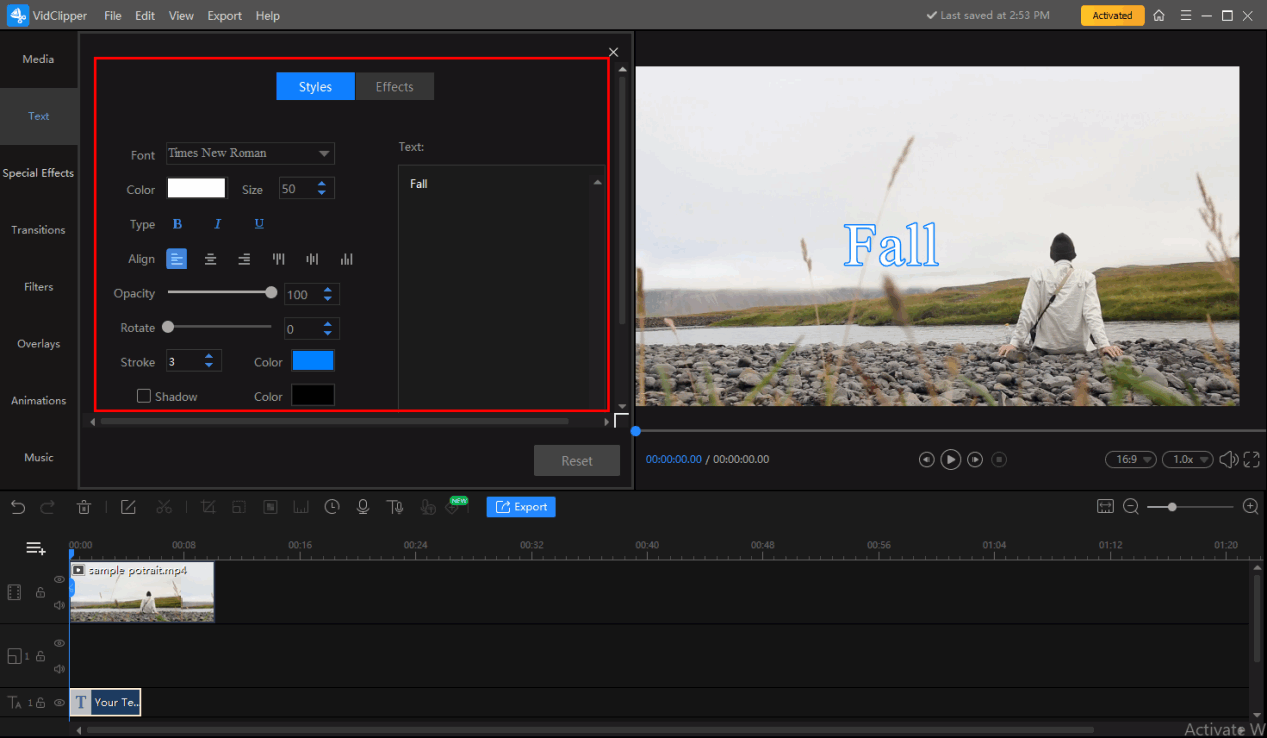 - Adım 4. Metni değiştirmek için metin zaman çizelgesine tek tıklayın ve ayarlarını/efektlerini seçin ve ardından Dışa Aktar düğmesine basın.