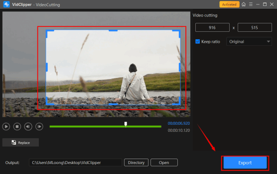 - Adım 3. Videonuzu yeniden boyutlandırmak için mavi çerçeveyi ayarlayın, en boy oranını değiştirin ve ardından Dışa Aktar'a basın.