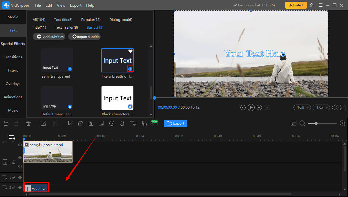 - Adım 3. İstediğiniz metni seçin ve ardından küçük + simgesine tıklayarak metni videonuzun altındaki zaman çizelgesi.