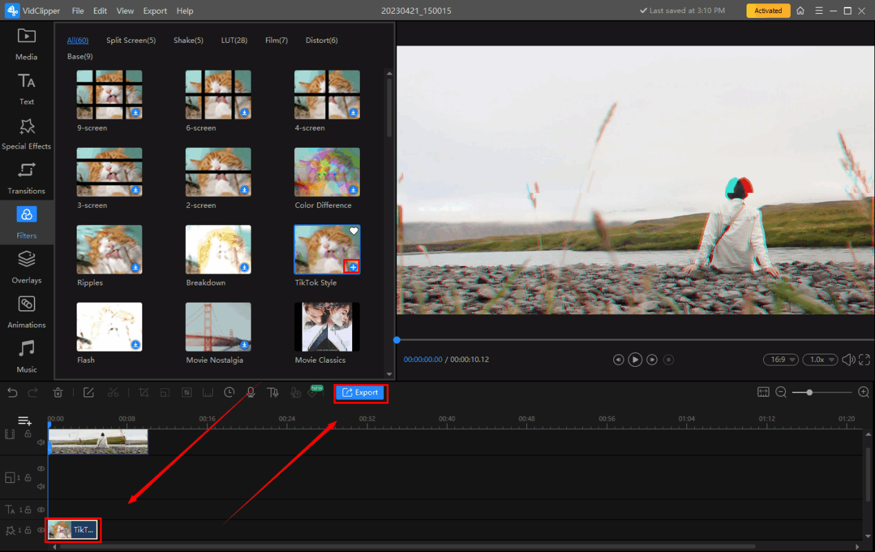 - Adım 3. Filtreler'i bulun, istediğiniz filtreyi seçin, eklemek için küçük + simgesine tıklayın videonun altındaki zaman çizelgesini seçin ve ardından Dışa Aktar'a basın. (Önizleme için filtreye bir kez tıklayın etki.)