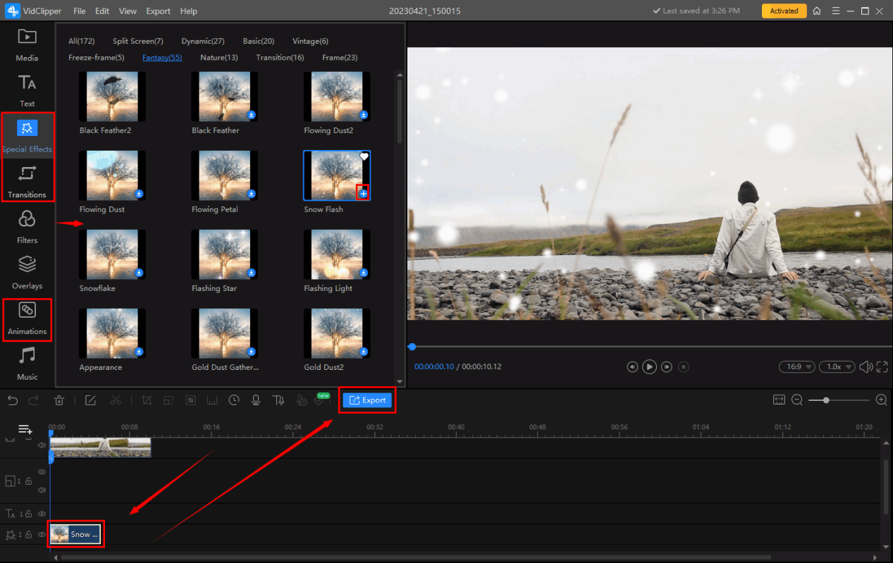 - Adım 3. Geçişler, Özel Efektler veya Animasyonlar'ı bulun, istediğiniz öğeyi seçin, videonun altındaki zaman çizelgesine eklemek için küçük + simgesine tıklayın ve ardından Dışa aktarın. (Efekti önizlemek için öğeye bir kez tıklayın.)