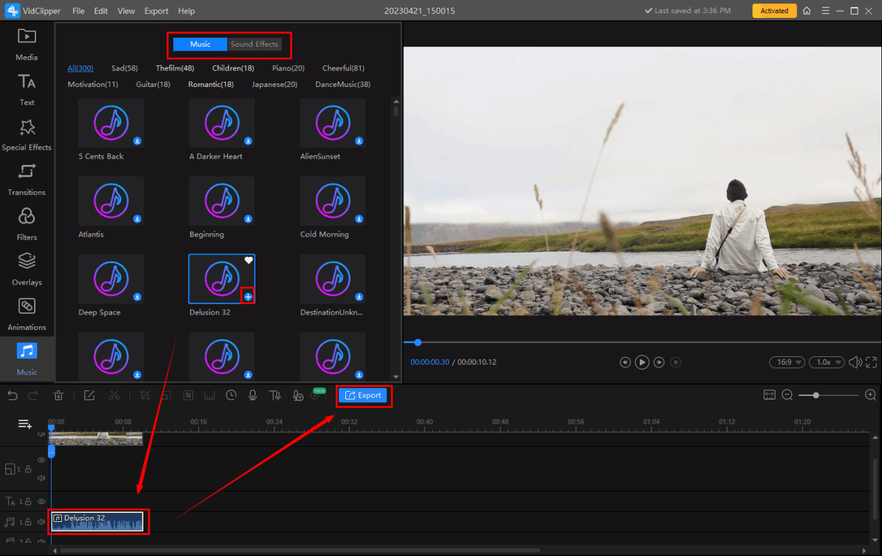 - Adım 3. Müzik'i bulun, istediğinizi seçin (Müzik veya Ses Efektleri), küçük + simgesine tıklayarak videonun altındaki zaman çizelgesine ekleyin ve ardından Dışa Aktar'a basın. (Videonun altındaki efekti önizlemek için bir kez müzik/ses efekti).
