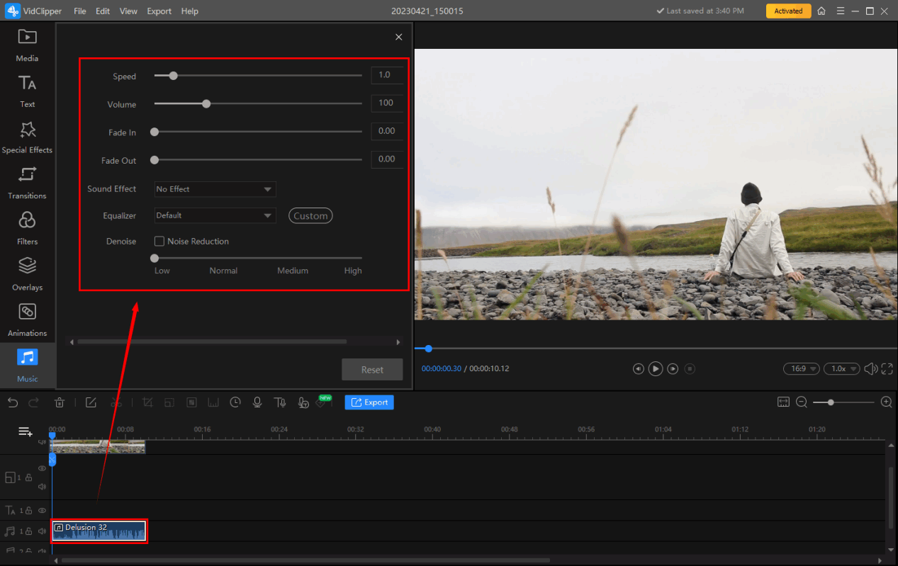- Not: VidClipper'ın ses düzenleme sayfasını açmak için zaman çizelgesindeki müziğe tek tıklayın, Seçilen sesin ayarlamalarını yapmanızı sağlar.