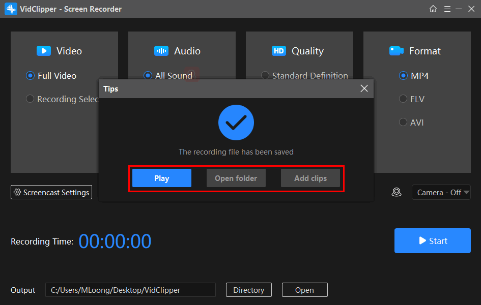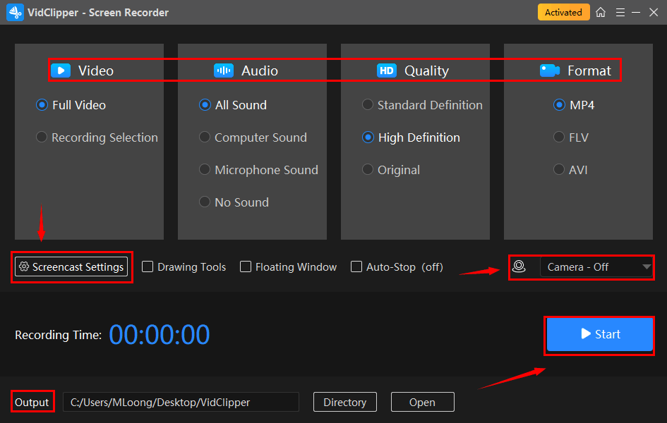 - Adım 2. Kayıt alanınızı, ses ve çıkış kalitenizi/formatınızı seçin, kayıt ayarlarını ve isterseniz kaydetme yolunuzu değiştirin ve ardından Başlat (Kısayol tuşu--Alt+F1).