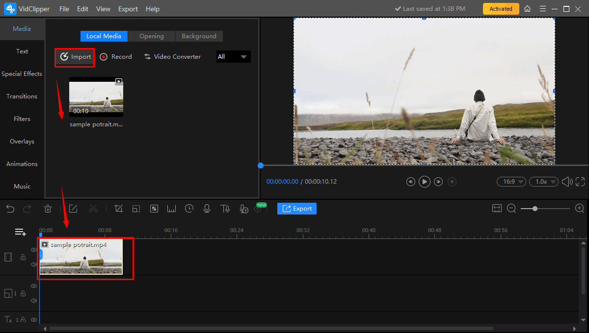 - Adım 2. Videonuzu yüklemek için İçe Aktar'a basın ve ardından aşağıdaki zaman çizelgesine sürükleyin.