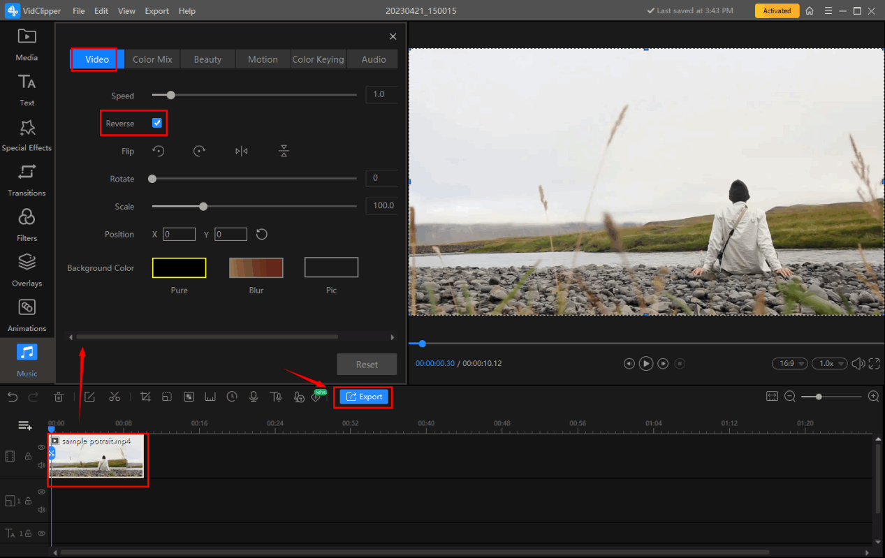 - Adım 3. Video ayarlama sayfasını açmak için zaman çizelgesindeki videoya tek tıklayın, Video > Ters seçeneğini bulun, videonuzu ters çevirmek için bu seçeneği işaretleyin ve ardından İhracat.