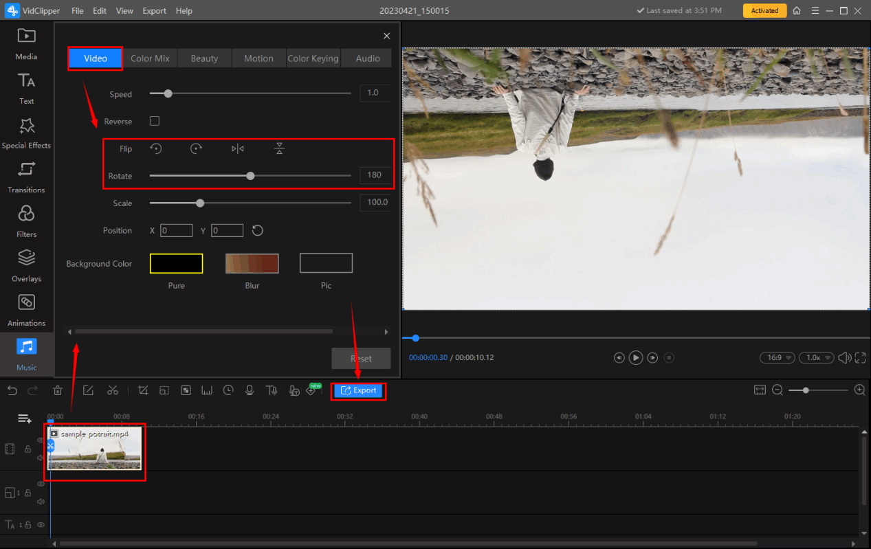 - Adım 3. Video ayarlama sayfasını açmak için zaman çizelgesindeki videoya tek tıklayın, Video > Çevir/Döndür öğesini bulun ve ardından Dışa Aktar öğesine basın.