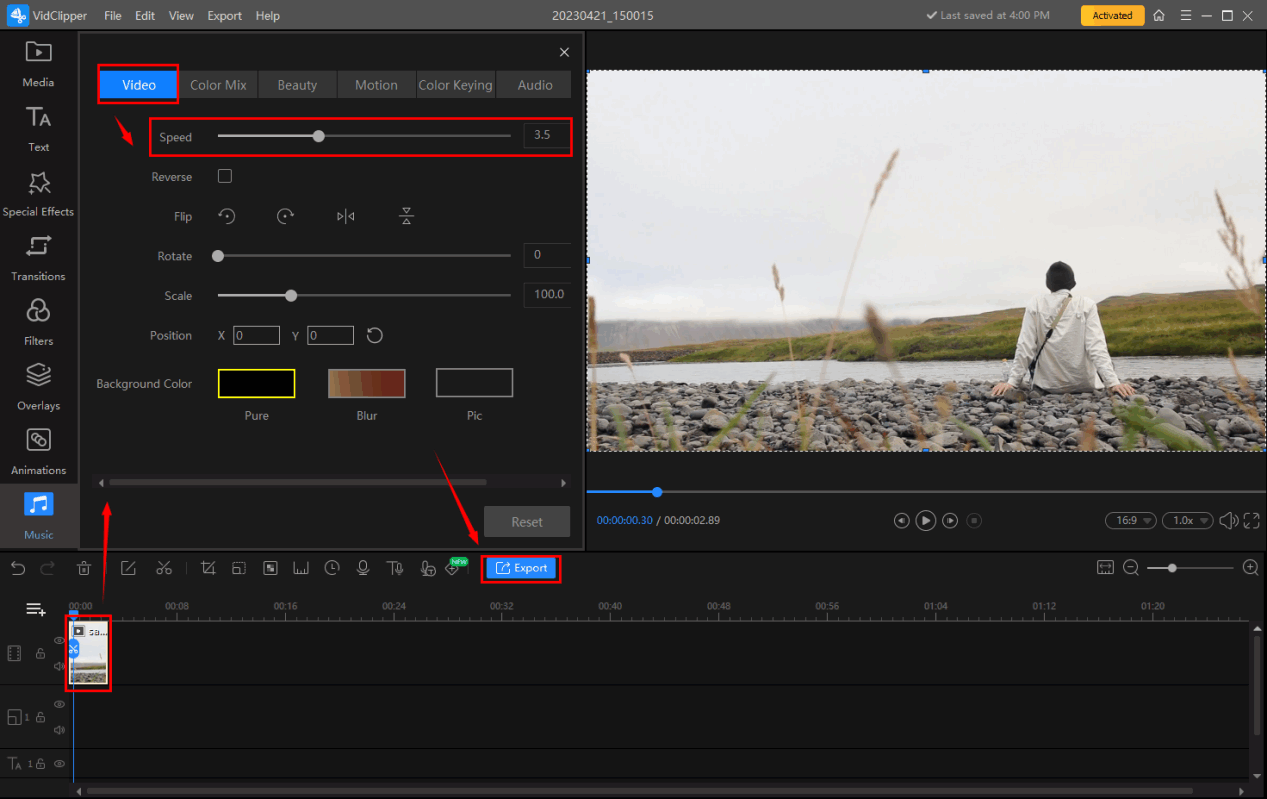 - Adım 3. Video ayarlama sayfasını açmak için zaman çizelgesindeki videoya tek tıklayın, Video > Hız öğesini bulun, video hızını değiştirmek için beyaz kaydırıcıyı ileri/geri hareket ettirin ve ardından Dışa Aktar düğmesine basın. (Yavaş Hız: 0.1X-0.9X/Hızlı Hız: 1.1X-10.0X)