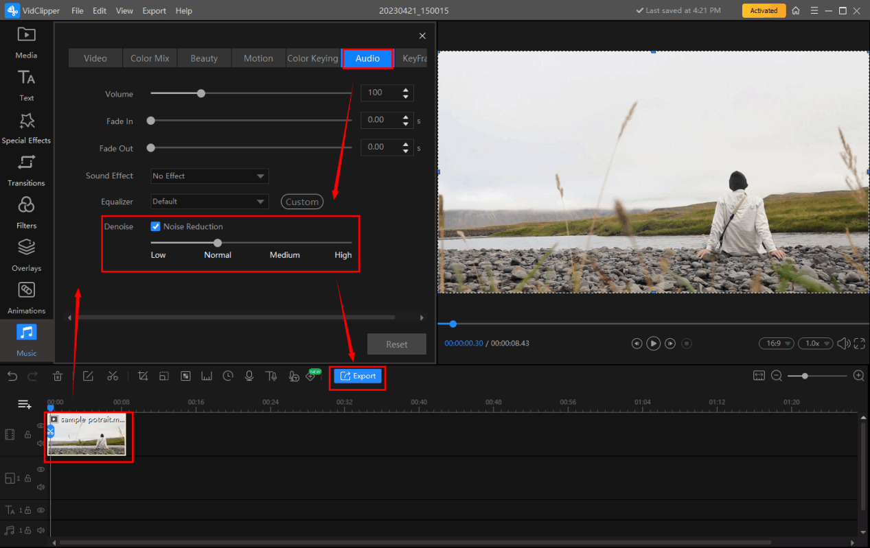 - Adım 3. Video ayarlama sayfasını açmak için zaman çizelgesindeki videoya tek tıklayın, Ses > Denoise öğesini bulun, denoising yoğunluğunu belirlemek için bu seçeneği işaretleyin ve ardından Dışa Vur. (Denoising Yoğunluğu: Düşük, Normal, Orta ve yüksek).