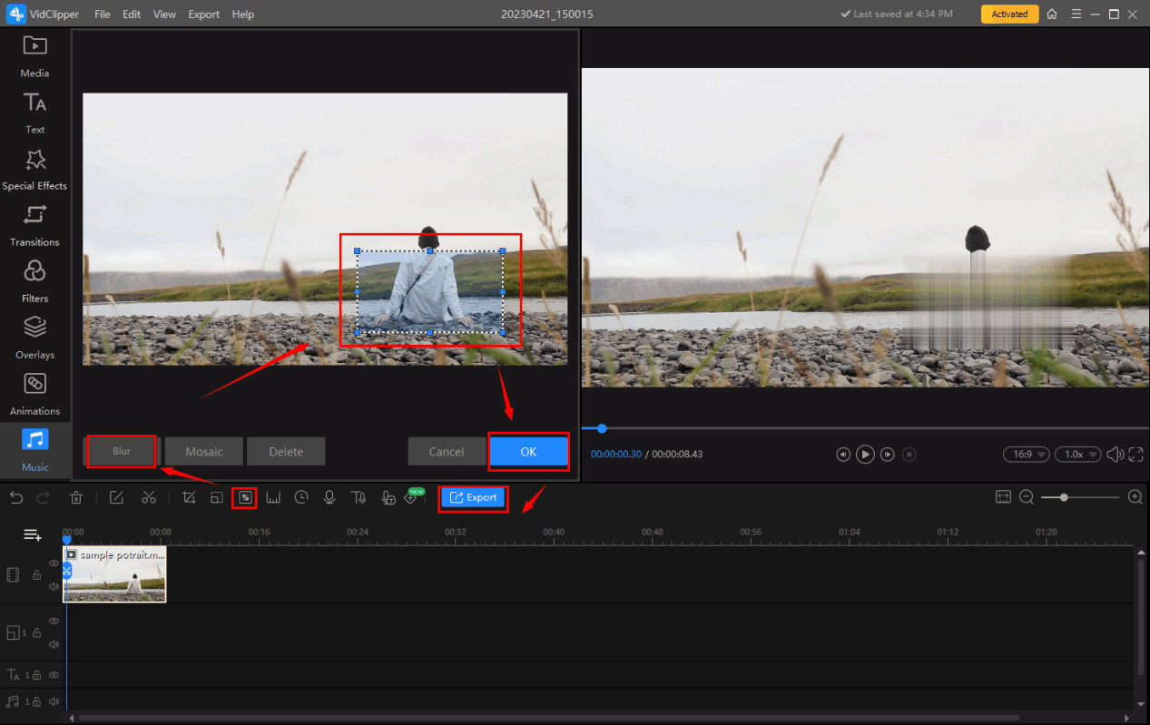 - Bulanıklaştırma: Mozaik simgesine tıklayın, Bulanıklaştırma'yı seçin, çerçeveyi bulanıklaştırmayı planlayın ve ardından Tamam > Dışa Aktar'a basın.