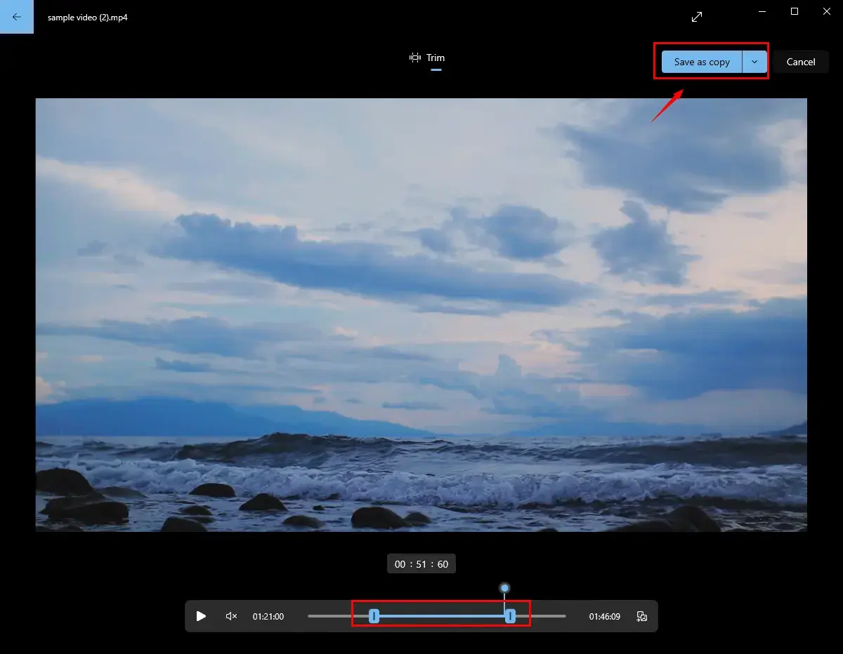 - Drag the front and end sides of the blue progress bar and then hit Save as copy.